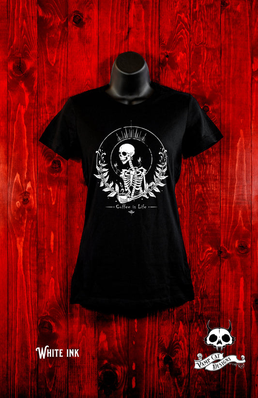 Coffee Is Life-Women's Tee-Coffee Lovers Fan Art-Dark Apparel-Skeleton Tee-Women's Top-Gothic Tee-Skulls and Coffee-Coffee Art Gifts