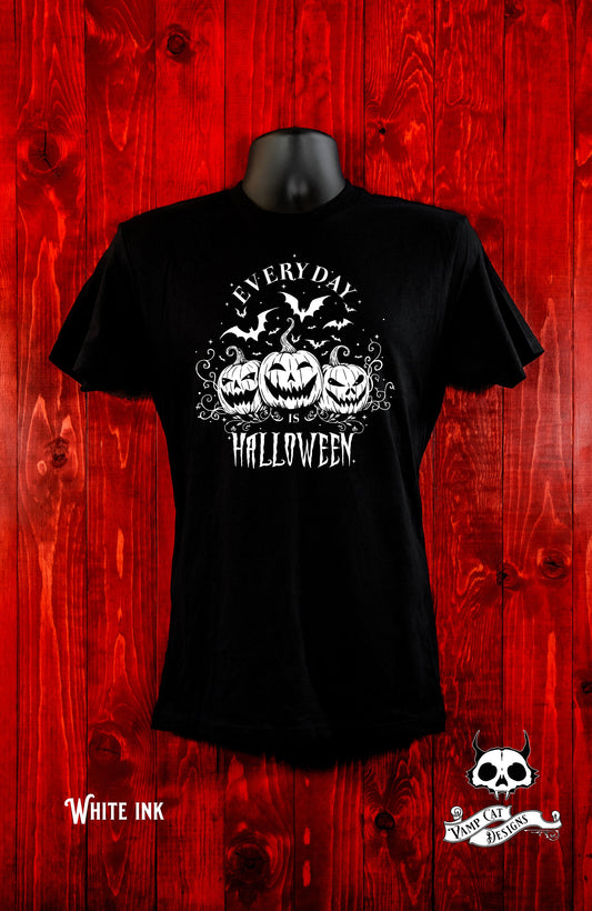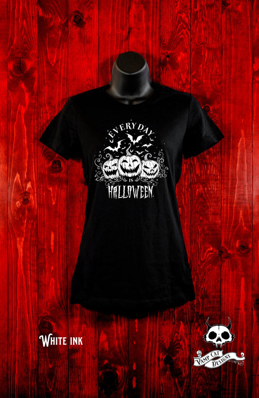 Everyday Is Halloween-Women's T-Shirt-Halloween Art-Halloween Apparel-Witchy-Gothic-Jack O' Lantern Graphic Tee-Bats And Jack O' Lanterns