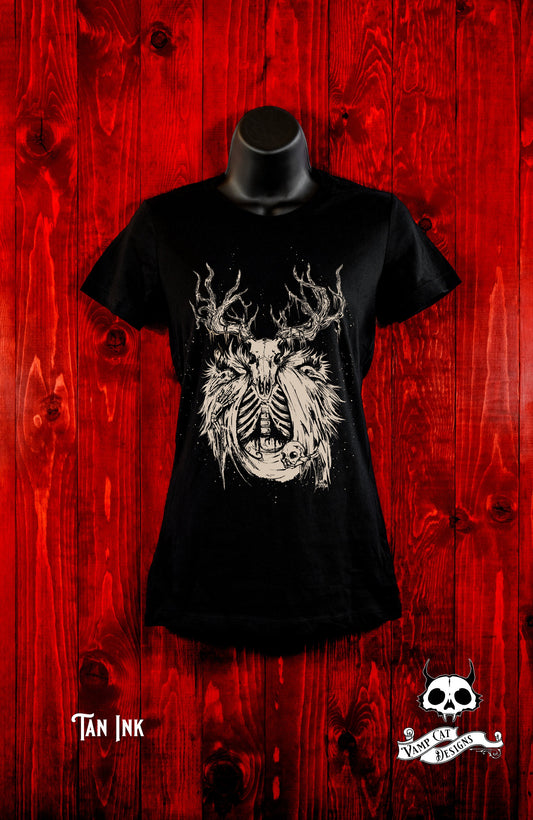 Necromancer-Women's Tee-Buck Skull-Illustration-Art T-shirt-Witchy-Dark Apparel-Occult Tees-Gothic Tee-Magic-Elks-Animal Skulls-Gothic Art