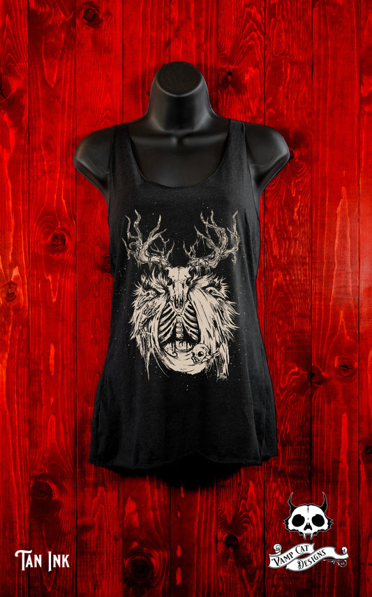 Necromancer-Tank Top-Racer Back-Buck Skull-Illustration-Tee-Witchy-Dark Apparel-Occult Tops-Women's Top-Gothic Tee-Magic Elk-Animal Skulls