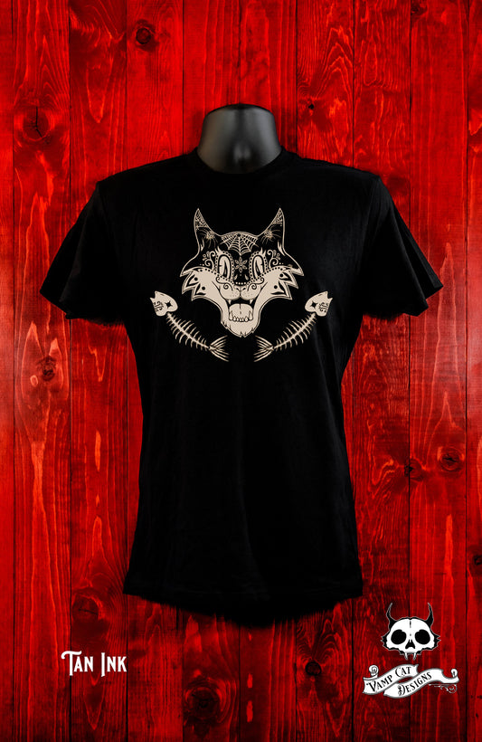 Vintage Cat & Fish Crossbones-Dia De Los Muertos-Unisex Jersey Tee-Men and Women's Tee-Cat Apparel-Day of The Dead-Cat Art-Vintage Style Cat