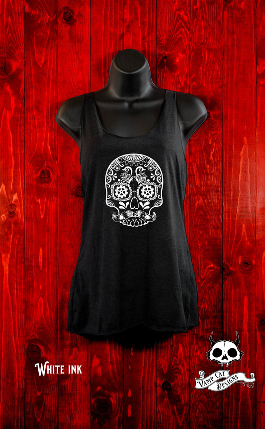 Sugar Skull-Mustache Steampunk-Tank Top-Racer Back-Steampunk Skull-Illustration-Flowy Tank-Day of The Dead-Skull Tank Top