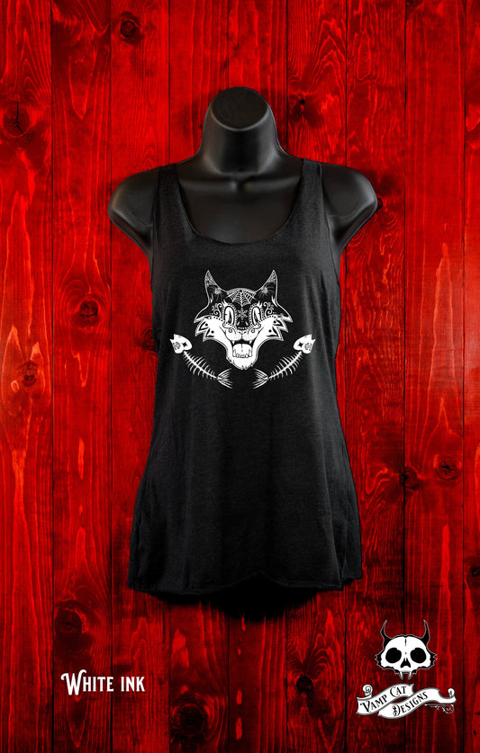 Vintage Cat and Fish Crossbones-Women's Tank Top-Mexican Art Designs-Dia De Los Muertos-Cat Apparel-Day of The Dead-Vintage Style Cat
