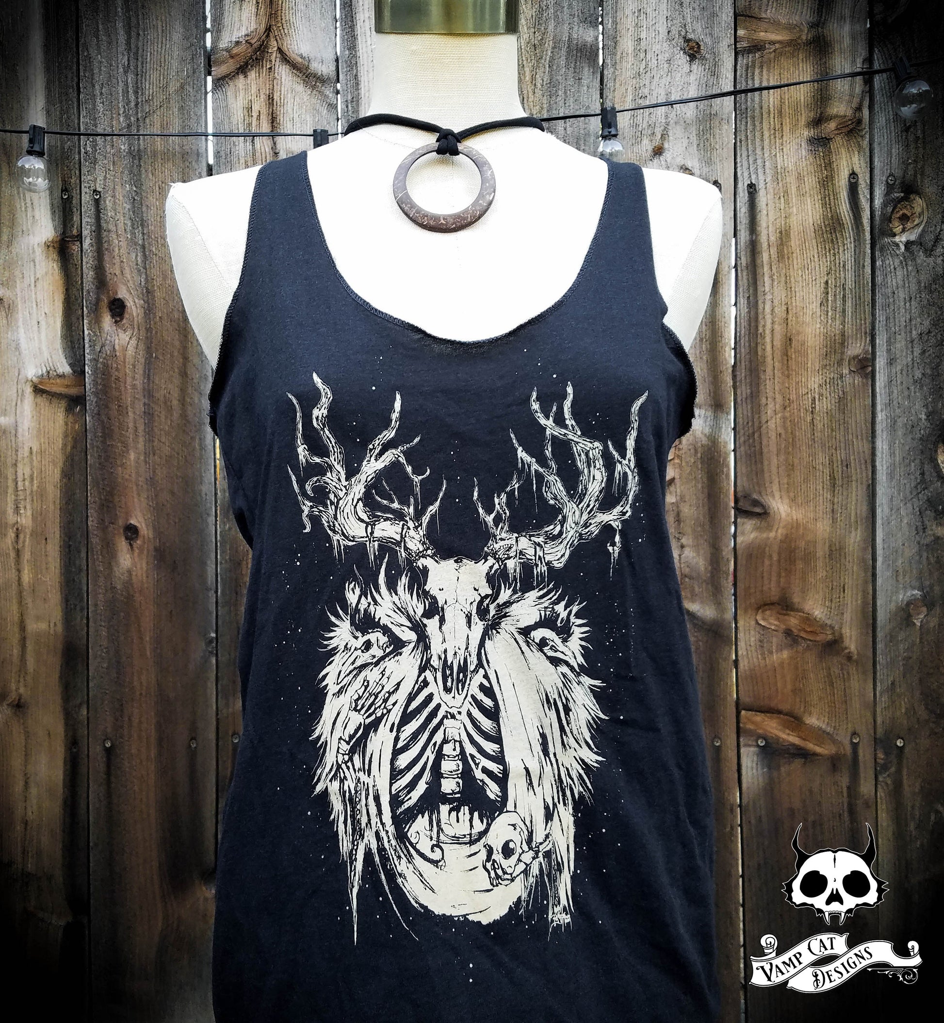 Necromancer-Tank Top-Racer Back-Buck Skull-Illustration-Tee-Witchy-Dark Apparel-Occult Tops-Women's Top-Gothic Tee-Magic Elk-Animal Skulls