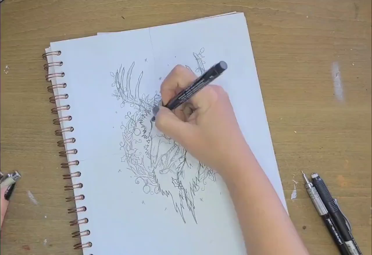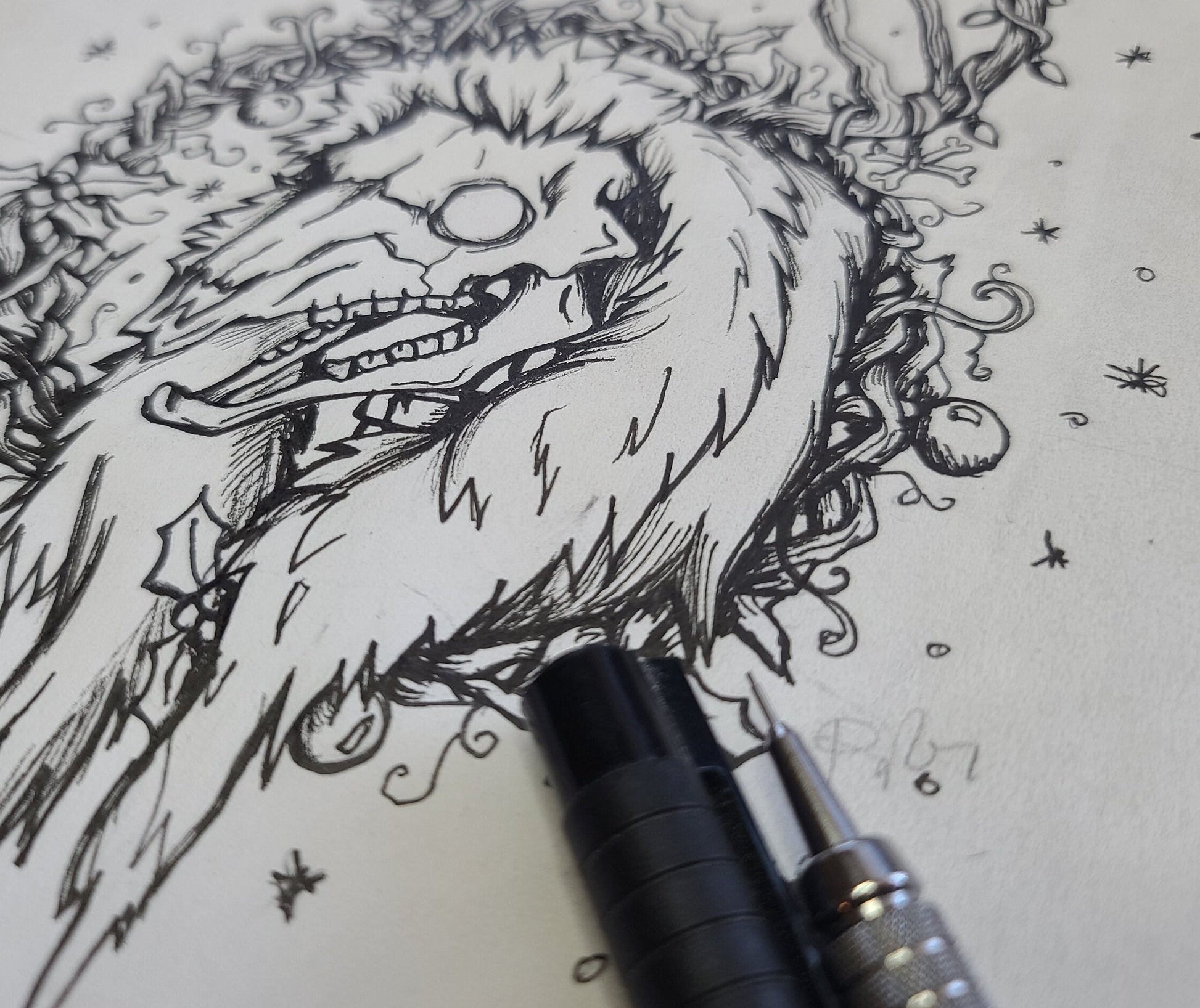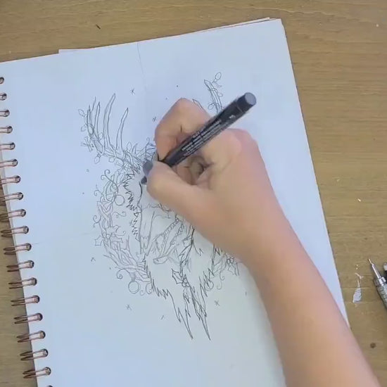 Originally hand drawn with pencil then finalized in pen, this Yule Deer Skull Wreath design will be a great piece to wear for any holiday events!